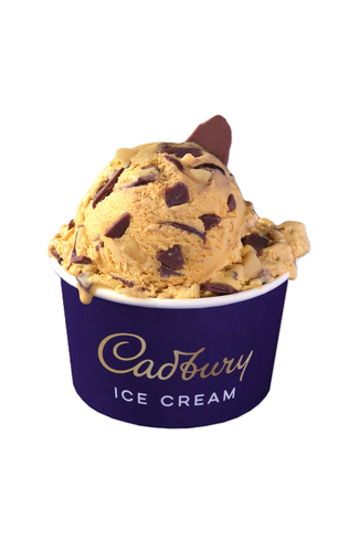 Honeycomb flavour ice cream with chocolate sauce (9%), Cadbury milk chocolate pieces (8%) and honeycomb pieces (4%).